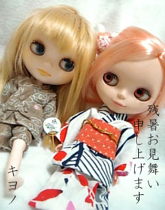 × [PR]上記の広告は3ヶ月以上新規記事投稿のないブログに表示されています。新しい記事を書く事で広告が消えます。 まだ大丈夫…だよね?季節的に…(ゼミでそういう授業取ったのに忘れてる)。 残暑お見舞い申し上げます。 まだまだ暑い日が続きますが、 皆さんお身体にお気をつけて楽しく毎日過ごしてくださいね ![]() それにしてももう少し大きな画像で撮れば良かったな(笑) やっぱり園は凛くんが好きらしく(笑)、一緒に撮ってあげたら またまたすごく乙女な顔してくれたんだけどなー。もったいない!(笑) 凛くんの甚平は御二九さんに誕生日プレゼントでいただいたものです ![]() 前に色違いのものを借りたことがあったのですが、 それは試作品だったってことで、新たにこちらをいただきました ![]() 小さいうちわまでつけてくれて嬉しかったです(^^) これいただいたときに、絶対浴衣とツーショで撮る!って思ってたので 実現出来て嬉しかったー御二九さんありがとう! 実は凛くんのまぶた上げる方の紐が伸びて切れかけちゃったので 新しいの付け替えるために開頭したんですが、 その際に髪を纏めて熱湯につけて、頭皮をそのまんまにしてたら 変な癖がついてしまい…今も戻ってません ![]() 耐熱ウェフティングなので何とかコテとかドライヤーとか色々使って 直らないかやってみてるんですが…うーん、なかなか ![]() よく見たらわかると思うんですがこのままじゃ髪浮きまくりですっ(笑) 園はとっても乙女な顔をしています(笑) それにしても本当まだまだ連日暑いですね! しっかり水分取って、残りの夏を存分に楽しみましょうね ![]() PR 一つ前の記事が長くなりましたので、こちらで拍手お返事させていただきますね(^^) あ、あと。コメント欄をまた復活させてみました。(つけたり消したりですいません )もし良かったらコメント欄からでも拍手からでもお気軽にお話していただけると嬉しいです ![]() 今まで色々忙しかったりなんだりでここもかなり不定期更新だったのですが、 最近は少し余裕も出来てブライスと関われる時間も増えたことだし、 私ももっと積極的に色々していきたいなあーって最近思いはじめたんですよ。 憧れサイトさんとか素敵ブログさんとか、 コメントさせていただきたいサイトさんがいっぱいあるんです。 でもそれにはまずこの超チキンな性格を直さないとね…ってことで。。。(苦笑) 少しずつ色々やっていきたいなあと思ってます。 何だかよくわかないない文章ですみません ![]() 収納は拍手お返事です。