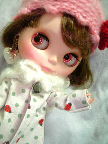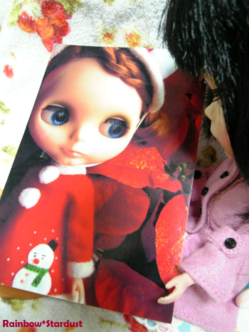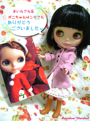 月子「素敵な人… 」月子が見とれています。 お友達にクリスマスカードを~ってまいんさんが ご自身のブログで書かれてたのは拝見してたんですけど、 まさか私にも送ってくださるとは思ってなかったので…感激でした(;_;) ボニちゃん、すっごく可愛い~(*´▽`*) ふんわりした表情にすごく癒されます。 もう本当にまいんさんには素敵なものをいただいてばかりなので、 来年こそはお礼を・・・! まいんさん、本当に素敵なカードをありがとうございました! さてさて!とうとうクリスマスが間近に迫ってきましたね(^v^) 私も、クリスマスだけはとりあえず卒論は置いておいて(笑)、 プレゼント持っておでかけするつもりです ![]() ![]() なので、当日は家に居ないと思うから先に更新しときます。 (とはいえ出かけるのはイブなので、それまでは家にいるんですけどね…笑) 忙しくてクリスマスのものとか全然買ったりしてないので、 唯一それっぽい(笑)我が家の天使さん~ ![]() (何もないからって加工したら微妙になった~汗) それでは皆さん、良いクリスマスを~(*´∀`*)ノシ 更新してみたり。(今は7時半過ぎくらい) というのも、ここ最近卒論を夜から朝にかけて書いてて、 完璧に昼夜逆転の生活をしていたので、 昨日一日ほぼ徹夜(完徹前に力尽きた…笑)して、リズムを元に戻したんです。 そのせいか今日は4時から起きています(笑)極端です( ̄д ̄;) でもせっかく早く起きれたんだから、今日は授業の時間まで書きます。 頑張るぞp(`・ω・´)q この写真…まるで顔がおまんじゅうのようだ…(笑) なんか時々ブライスはどう撮ってもまるまると写るときがあります。 なんかおいしそう(笑) あ、コートのボタンが取れっぱなしですが、 ボタンが行方不明になってしまったのでスルーでお願いします ![]() もうすぐクリスマスですね ![]() なんかやっぱり心がうきうきするイベントです ![]() ちょっとでも時間作れるように、今から頑張ってきまーす ![]() ![]() |